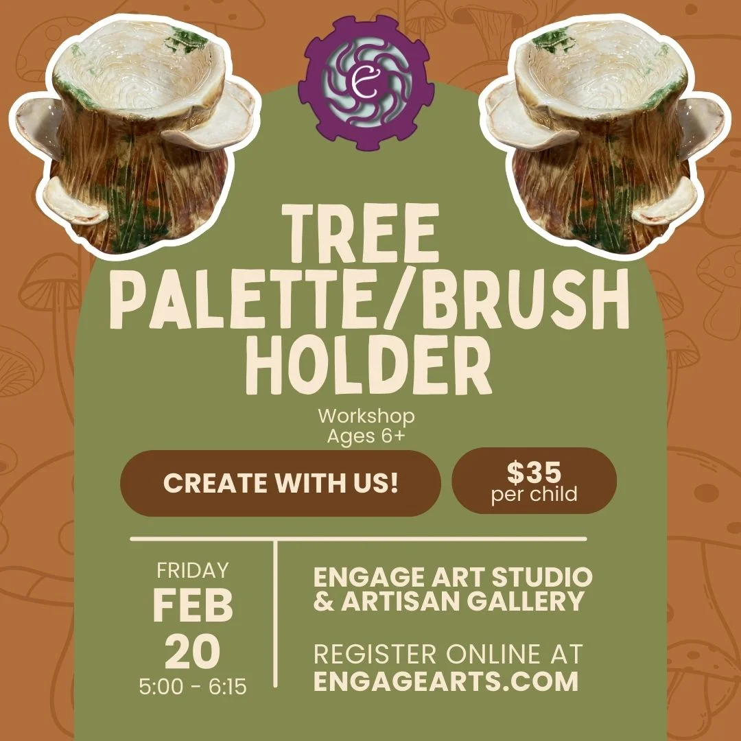 Friday, February 20 from 5:00-6:15 pm – Tree Palette/Brush Holder (Ages 6+): Create a whimsical tree covered in mushrooms to hold your paints, water, and brushes! Projects do require pick-up at a later date. Drop-off available. Our waiting room, which has a clear view into the classroom, offers 5-10 seats for parents. Parents/guardians are not allowed to be in the classroom once the workshop has begun.