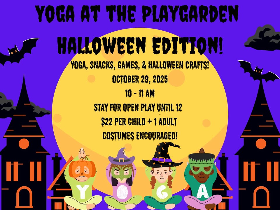 Flow through a fun Halloween-themed partner yoga class, then enjoy games, snacks, and crafts! Stay for open play until noon! Costumes are encouraged (for caregivers & children!)