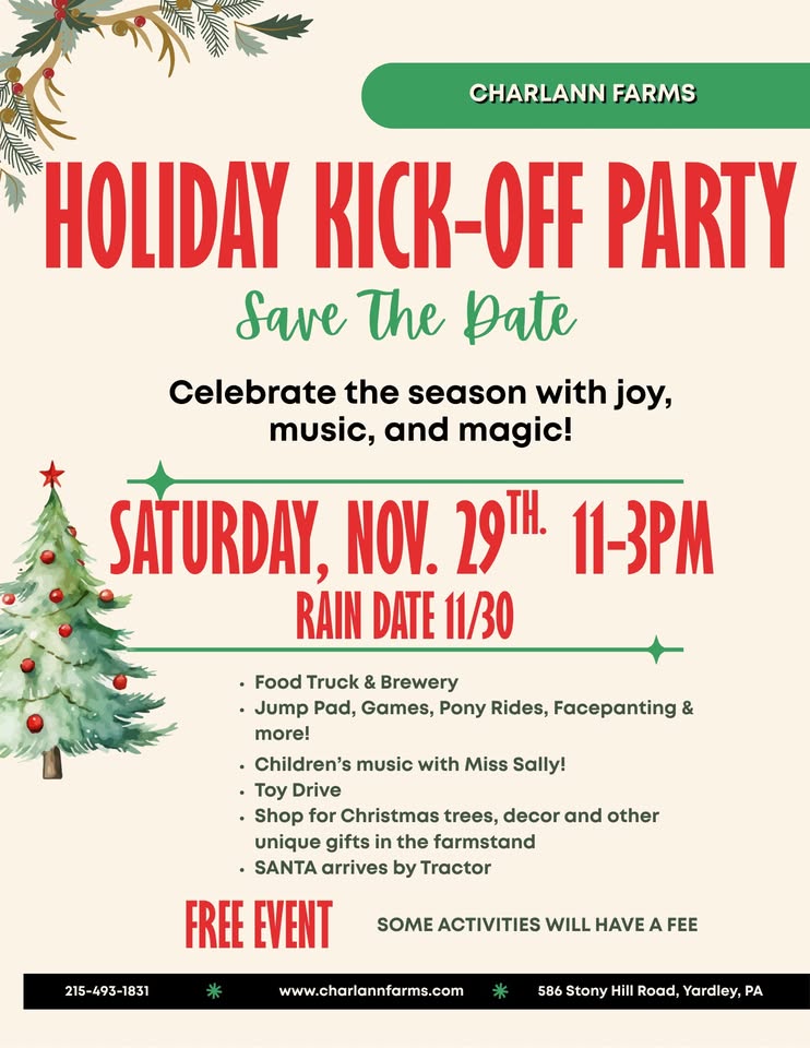 Join us on Saturday, November 29th for a fun, family-friendly Holiday Kick-Off Party! 11-3pm! Raindate Sunday, November 30thRooster & The Chick Food truck and Broad Street Brewing will be here! Children’s music with Miss Sally around 11:30!Santa will arrive on a tractor around 12:30 and will be available for Take Your Own Photos ($12).We will have the Jump Pad, pony rides, face painting, holiday-themed games and More!Pick out the perfect Christmas tree, sip on hot cocoa and enjoy shopping in our holiday barn! Visitors are encouraged to bring an unwrapped toy for our toy drive, benefiting Neighbor in Need! *this is a FREE event. Some activities will have a fee.*Santa arrival time subject to change. Stay tuned on social media for finalized times the week leading up to the event!