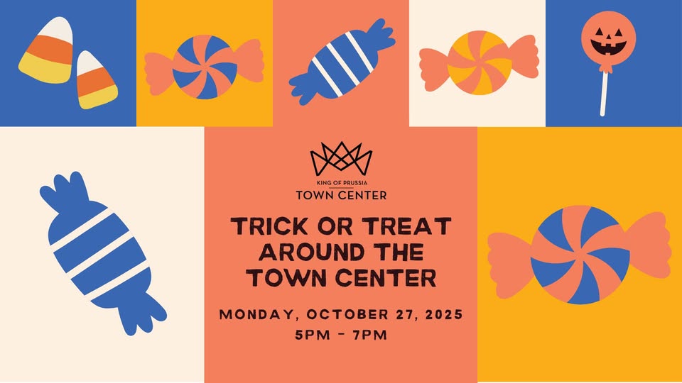A Spooky Annual Tradition Returns! Celebrate the season at the 6th Annual Trick-or-Treat Around the Town Center! Families, friends, and trick-or-treaters of all ages are invited to enjoy an evening filled with costumes, candy, and community fun. Stroll through the Town Center as participating shops and restaurants hand out treats, join in on games and activities on the green, dance along with our DJ, and capture the memories at festive fall photo spots. Enjoy: Candy from participating tenants Music and dancing with a live DJ Family-friendly photo opportunities Games and activities on the green Seasonal décor throughout the Town Center When: Monday, October 27, 2025 | 5:00 – 7:00 PM Where: King of Prussia Town Center Costumes encouraged! Bring your family and friends for a night of treats, laughter, and fall fun.FREE EVENT – registration NOT required.