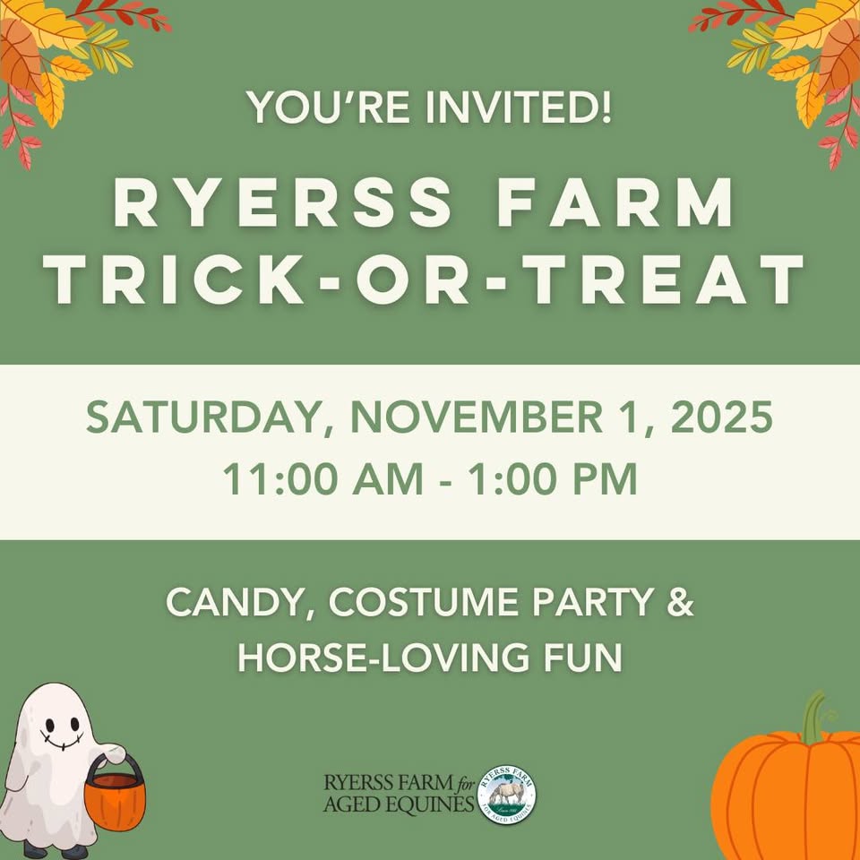 Join us for a "sweet-n-spooky" celebration at our 2nd Annual Ryerss Farm Trick-or-Treat! Bring your kids in their favorite costumes for a day of family fun. Spend time with our cherished residents and explore our gift shop. Admission is FREE, but donations are always appreciated