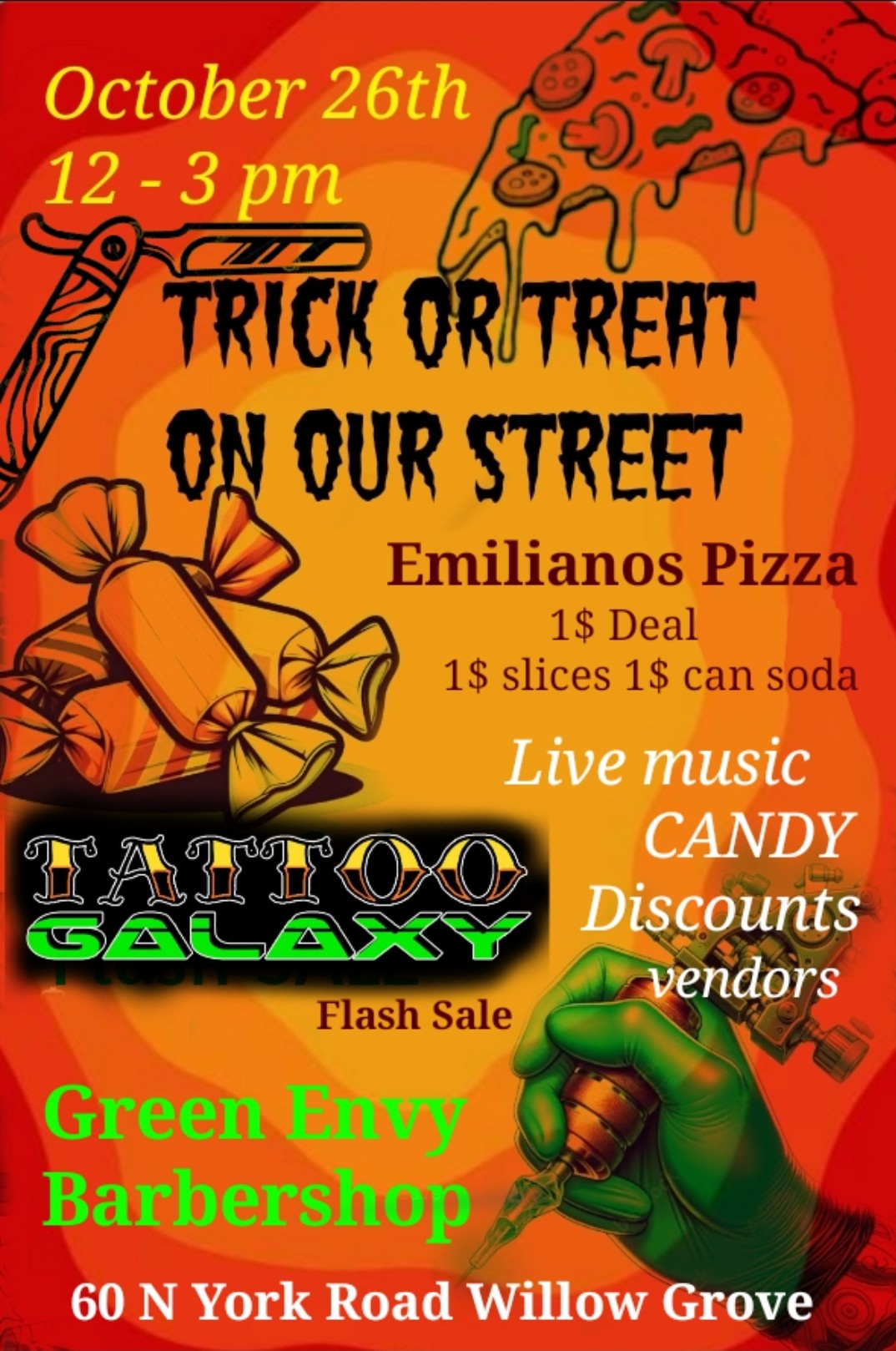 *Emilianos Pizza*Tattoo Galazy*Green Envy Barbershophave teamed up to celebrate the Holidays by giving back to our community that has supported us continuously!Live music will be performed by*Erica Scott Tattoo Galazy is offering HalloweenFlash sales!!!!! Emilianos Pizza is offering 1/2 OFFcoupons for future purchases!!! Green Envy Barbershop is offeringFree face painting !!!! Also local vendors to shop from ! Don't miss this special opportunity!!!Get to know your local shops!!Help us bring connection back to our community.