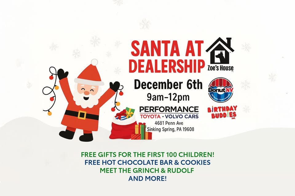 Santa at the Dealership – Free Family Holiday Event! Ho, ho, ho! Join us for a FREE family holiday celebration at Performance Toyota & Volvo Cars! Bring the whole family for a magical morning full of festive fun, sweet treats, special guests, and adorable pups looking for forever homes! Event Highlights Meet Santa & Mrs. Claus + FREE Photos Puppy Adoptions with Zoe’s House Rescue Meet The Grinch & Rudolph from Birthday Buddies (9:30AM–11:30AM) DonutNV Food Truck – Hot Donuts & Fresh Lemonade Candy Crushers – fresh cotton candy made on-site Face Painting Holiday Crafts & Coloring Station Free Cookies & Hot Chocolate Plus — free gifts for the first 100 children! When: Saturday, December 6th 9:00 AM – 12:00 PM Where:Performance Toyota4681 Penn AveSinking Spring, PA 19608