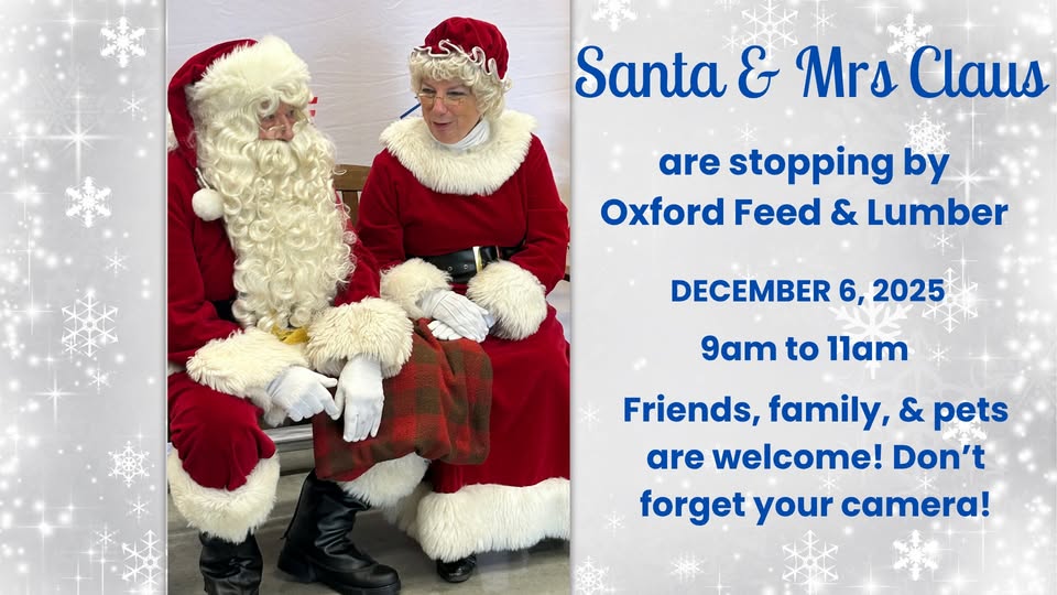 Santa & Mrs. Claus are coming to Oxford Feed & Lumber! One of our most popular events is back. Bring your kids, pets, and grandparents for photos with the Clauses. December 6 is the big day! Save the date and get ready for holiday smiles!