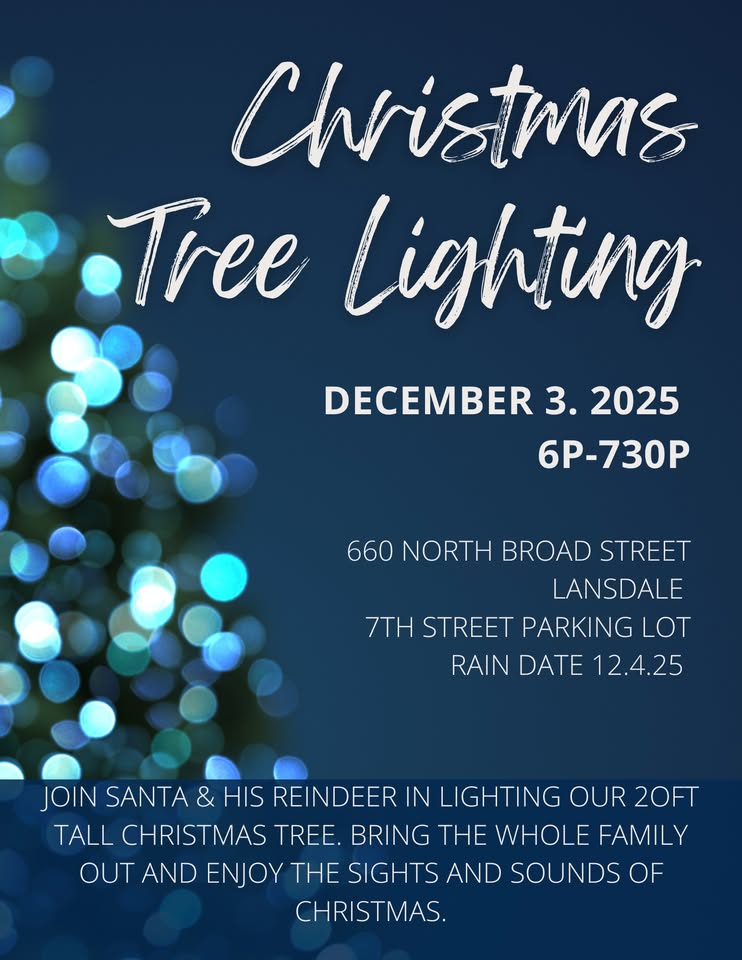 Join us for our Annual Tree Lighting on 660 North Broad Street, Lansdale (Parking Lot off 7th Street) Wednesday, December 3rd 6:00 – 7:30 PM Enjoy a festive evening with: Holiday carols Santa visits Real reindeer (and yes — the camel is BACK!) Cookies &  Hot cocoa And the big tree lighting you won't want to miss! Bring the whole family and kick off the holiday season with us — see you under the lights!