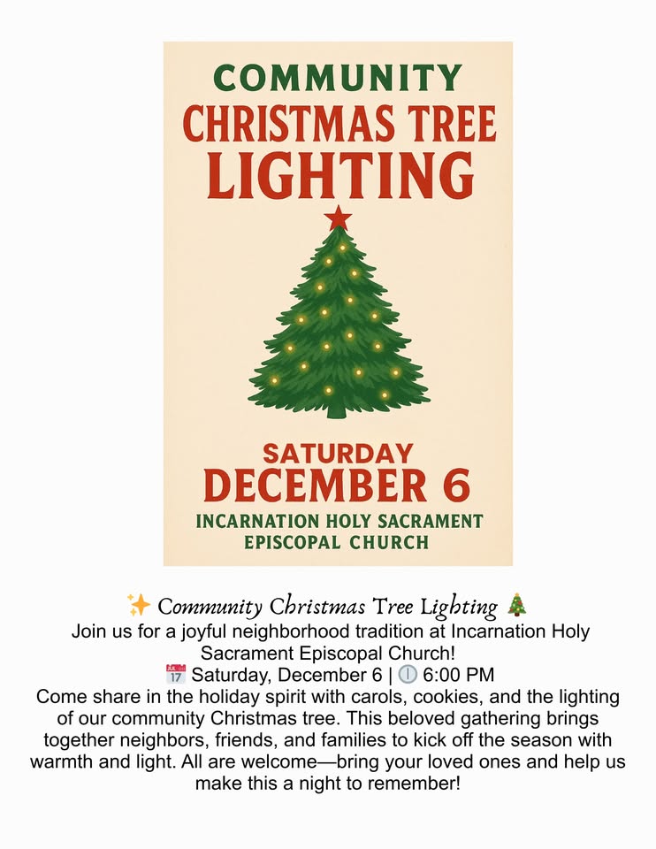 Come share in the holiday spirit with carols, cookies, and the lighting of our community Christmas tree. This beloved gathering brings together neighbors, friends, and families to kick off the season with warmth and light. All are welcome—bring your loved ones and help us make this a night to remember! |
