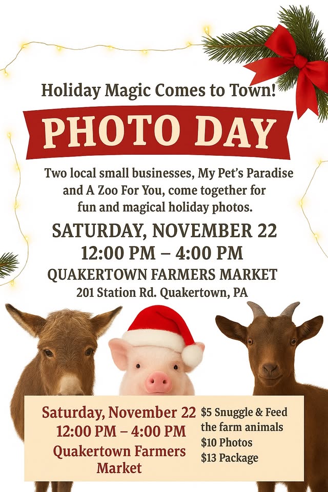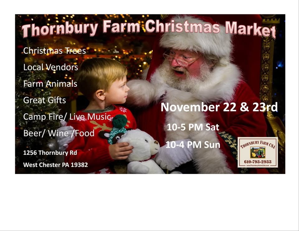 Join Us for the Thornbury Farm Christmas Market! Dates: Saturday, November 22rd (10 a.m. – 5 p.m.) & Sunday, November 23rd (10 a.m. – 4 p.m.) Location: Thornbury Farm, 1256 Thornbury Road, West Chester, PAKick off the holiday season at Thornbury Farm’s annual Christmas Market! This festive two-day event is packed with family-friendly activities, shopping, and holiday cheer. Event Highlights:• Local Vendors: Shop unique, handmade gifts from local artisans and small businesses – perfect for everyone on your list.• Live Music: Enjoy holiday tunes and live performances that fill the farm with the spirit of the season.• Santa Claus: Bring the kids for pictures with Santa himself!• Food Trucks, Beer & Wine: Savor delicious treats from local food trucks, warm up with a cup of hot cocoa, or enjoy beer and wine for the adults.• Farm Animal Feeding: Kids and families can enjoy feeding our friendly farm animals.• Kids’ Crafts: Little ones can get creative with holiday-themed crafts.• Market Shopping: Explore our farm market with fresh produce, local goods, baked treats, decor, and much more. Donation: A $10 donation for parking. All donations support future events and Thornbury Farm’s mission to serve our community.Celebrate with us, make magical memories, and support local this holiday season. We can’t wait to see you there!