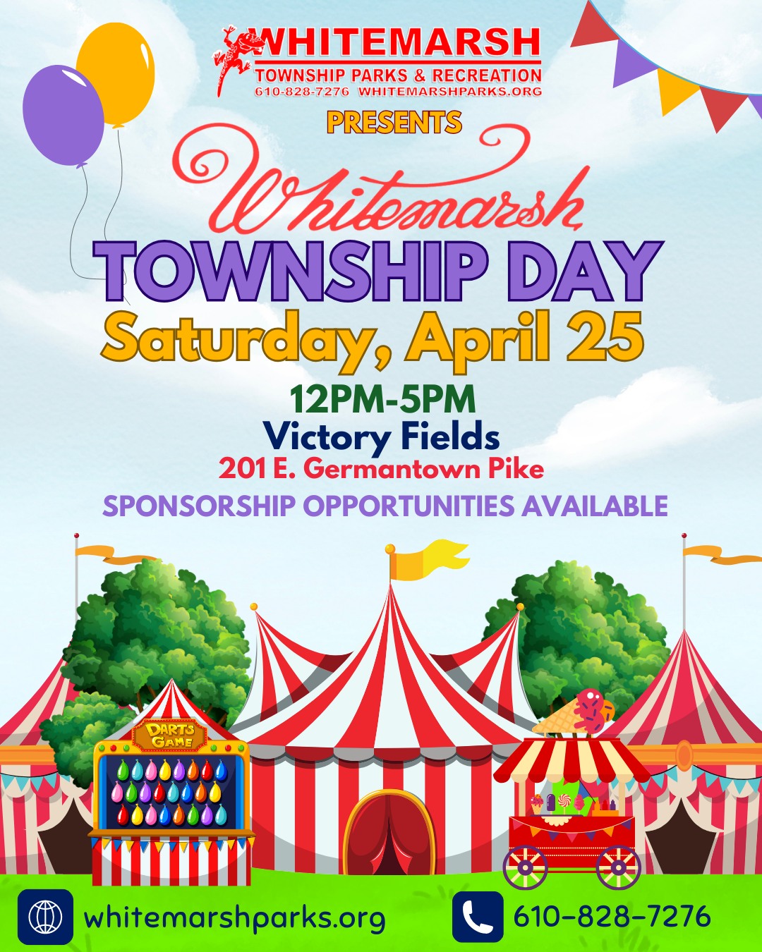 Join us for a fun-filled day of celebration of Whitemarsh Township! This family-friendly event will have local businesses & organizations, crafters & other vendors, games, inflatable attractions, a petting zoo, pony rides, tons of prizes, yummy treats & food trucks, live music & entertainment, and so much more! Township Day is free to attend, but a wristband or ticket is required to participate in any of the games, rides, inflatables, petting zoo, ponies, and all other attractions! Wristbands are on sale for $20.00 up until Friday, April 24th at 4:30pm. Day of wristbands are $25.00. Wristbands provide unlimited access to games/attractions for the entire day. You do not need to be a Whitemarsh Township Resident to purchase wristbands/tickets or attend! Cash & all major credit cards are accepted!