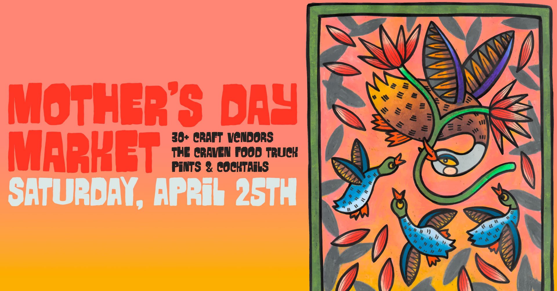 Join us Saturday, April 25th from 1-4PM as we host local talented vendors that want to help you find that one of a kind gift for Mom this Mother's Day. We will have 30+ curated, unique vendors to guarantee you leave with something special. The Craven will be out front for food, and indoors we'll be whipping up yummy cocktails and pouring pints. Thank you for supporting local and being a part of the transformation of the brewery into a sip & shop for Mom.