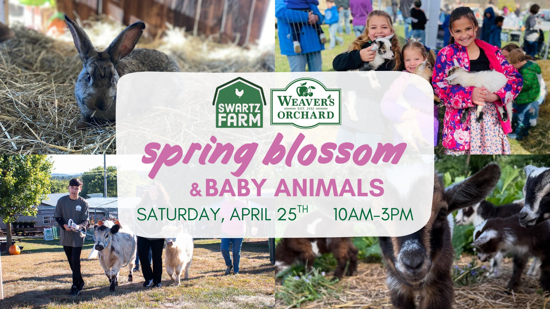 Saturday, April 25 | 10:00am – 3:00pm Weaver’s Orchard Spring is in the air — and so are tiny baas and baby goat hops!  Join us at Weaver’s Orchard for a fun-filled day celebrating baby animal season. Come meet all the newest arrivals and experience the magic of spring on the farm. You’ll get to meet: Baby lambs Fluffy chicks Baby goats Mini Highland cows Alpacas Bunnies In addition to all the baby animal cuddles, families can enjoy:  Apple Cannon Hayrides Kid-friendly activities throughout the orchard This is a limited ticket event and we expect it to sell out.Pre-sign up is strongly encouraged to guarantee your spot — once tickets are gone, they’re gone! Bring your family, invite your friends, and spend the day soaking up sweet spring moments at the orchard.