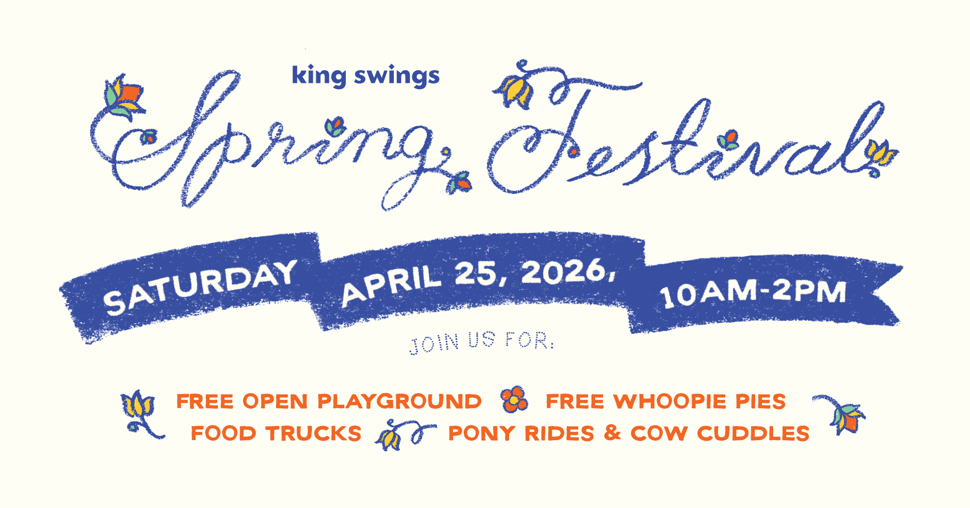 Join us for King Swings’ Annual Spring Festival on April 25th. Usher in the spring season with a day of open play! Families can enjoy our community playground and explore over 16 different swing sets.  Cuddle with Daisy, our Scottish Highland cow, and enjoy complimentary pony rides, face painting, and whoopie pies. Food trucks, including Cozy Corner Chicken BBQ, Sabatino's, and Fireside Cafe Coffee, will be in attendance for food and refreshments available for purchase. Bring your family, invite your friends, and enjoy a spring day on the farm. RSVP Today!