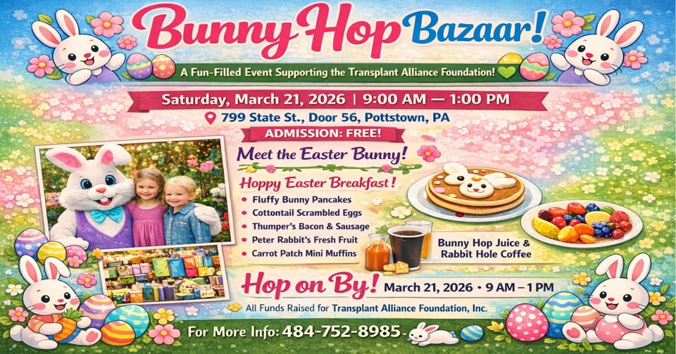 Bunny Hop Bazaar! Hop into spring with us for a day full of family fun, shopping, and Easter magic — all while supporting the Transplant Alliance Foundation!   Saturday, March 21, 2026 9:00 AM – 1:00 PM 799 State Street, Door 56, Pottstown, PA Admission: FREE! Preorder guarantees you a seat!  Meet the Easter BunnyBring the kids for photos and sweet Easter memories!  Hoppy Easter Breakfast Kick off your morning with our festive breakfast menu:Fluffy Bunny Pancakes with syrup and butterCottontail Scrambled EggsThumper’s Bacon & SausagePeter Rabbit’s Fresh FruitCarrot Patch Mini Muffins  Drinks:Bunny Hop Juice – refreshing orange juiceRabbit Hole Coffee – hot, fresh-brewed coffee  Vendors & CraftersShop local and explore unique handmade items and spring favorites.  Shopping GaloreFind something special for everyone while enjoying a fun community atmosphere! Bring the whole family for a joyful morning filled with food, fun, shopping, and Easter spirit — all for a great cause. We can’t wait to see you there!   For more details: 484-752-8985All funds raised benefit Transplant Alliance Foundation, Inc.