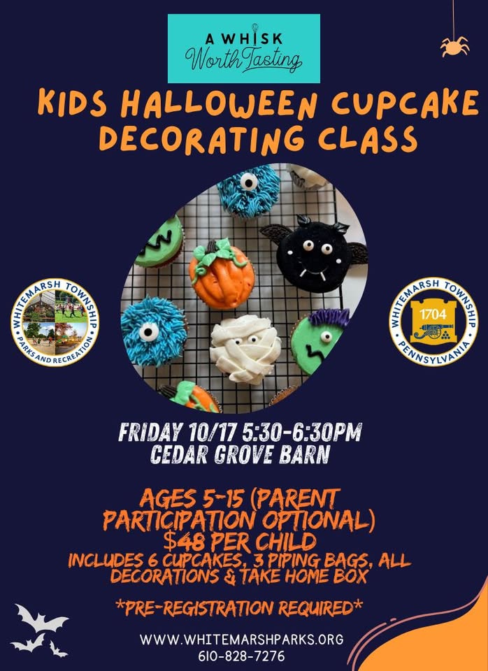 Join owner, Nika Spencer, of A Whisk Worth Tasting for some decorating fun! Young bakers will learn to make buttercream Halloween themed cupcakes! Each participant will receive: 6 unfrosted cupcakes, 3 pre-filled buttercream piping bags, sprinkles/decorations, and a take-home box! Register online at Community Pass or call us at 610-828-7276.