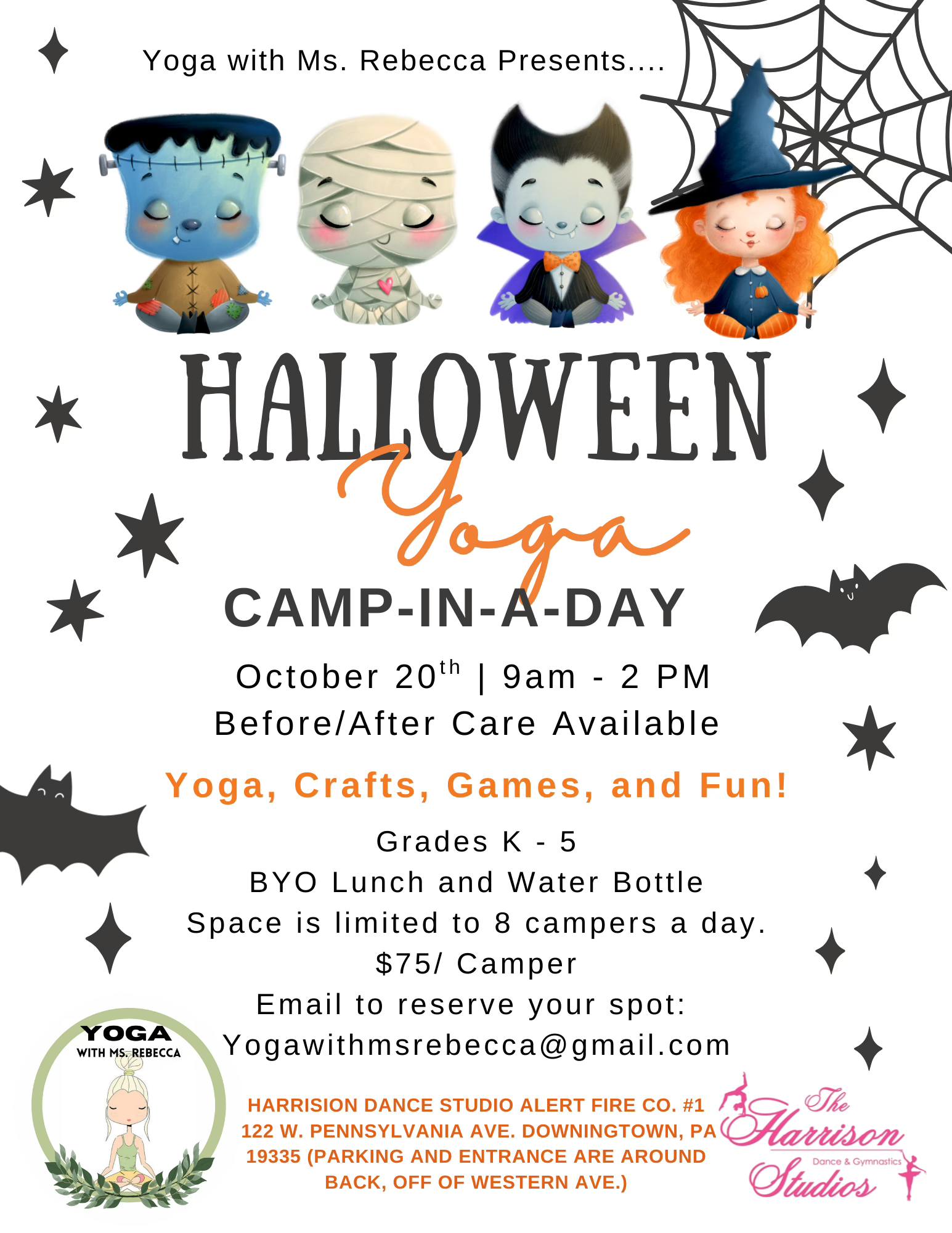 Yoga, crafts, games, and TONS of Halloween-inspired fun. Before/After care available at an additional cost. To reserve your spot, email: Yogawithmsrebecca.com or visit: https://www.yogawithmsrebecca.com/classes