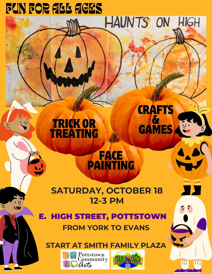 join us for a family friendly event with safe trick-or-treating, a kids' art show, face painting, crafts, games, and more!The Haunts route will run from Evans Street to York Street this year. We are excited to have Parks and Rec co-host this event with us. Our main hub will be at Smith Family Plaza. Start there to get your face paint or glitter tattoos applied. Then, walk the route to meet new businesses, local organizations, and collect candy.
