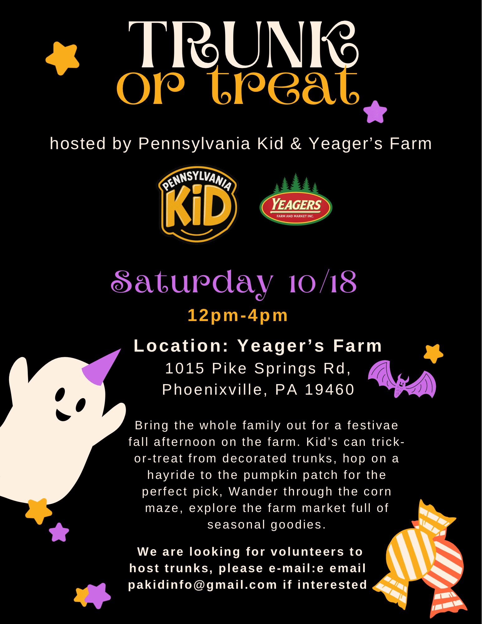 Bring the whole family out for a festive fall afternoon on the farm. Kid’s can trick-or-treat from decorated trunks, hop on a hayride to the pumpkin patch for the perfect pick, Wander through the corn maze, explore the farm market full of seasonal goodies. Trunk or Treat: FREE $7/pp or $20/family: Hayride & Corn Maze Pumpkins in the patch are $.65/lb We are looking for volunteers to host a trunk, everyone is welcome to! Please email pakidinfo@gmail.com if interested. When: Saturday, October 18th (Rain date: 10/25) Time: 12-4pm Where: Yeager’s Farm 1015 Pike Springs Rd, Phoenixville, PA 19460