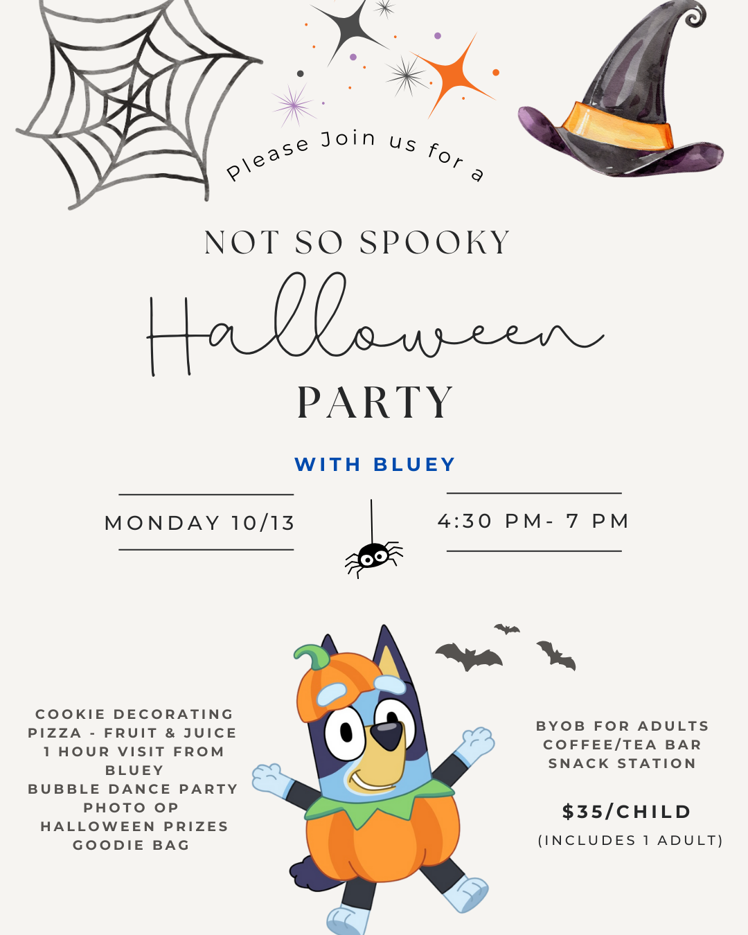 $35/ 1 child + 1 adult Bluey will be making his appearance for 1 hour from 5 PM- 6 PM to join the kiddos for a bubble dance party, photo op & story-time. Pizza, fresh fruit, juice boxes will be included, all the littles will be decorating Halloween cookies! Fun filled games will be provided with prizes to win and goodie bags for each kiddo to take home / A friendly reminder that it’s BYOB for the adults and socks are required for ALL guests. Any child under 6 months gets free admission with a paying sibling