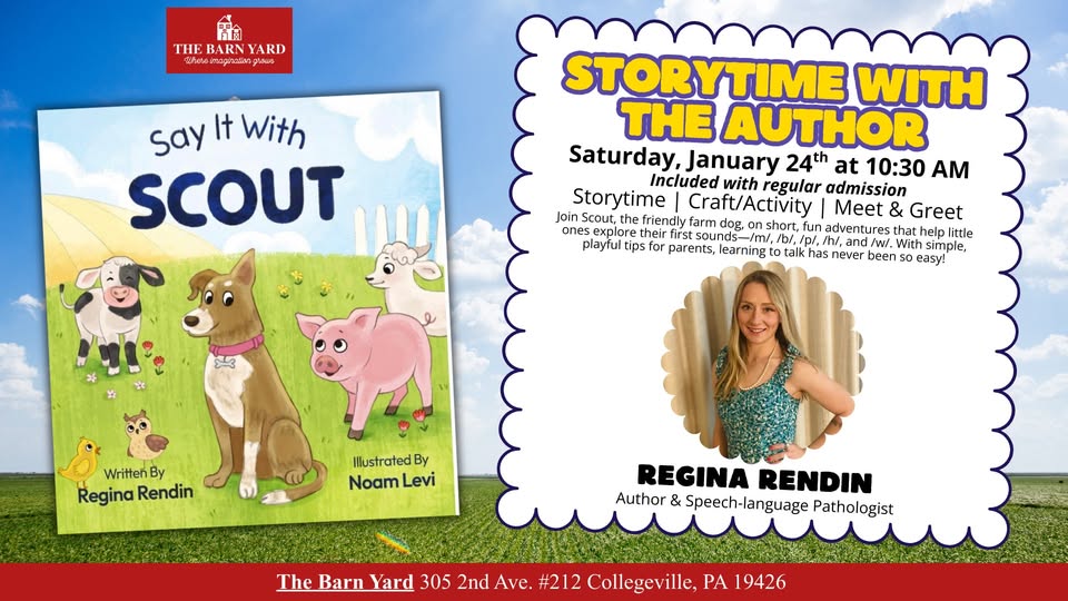 Storytime with the Author: Say It With Scout! * Included with regular admission* Join us for a special storytime featuring the author of Say It With Scout — a sweet, engaging book designed to help little ones build their very first sounds! "Say It With Scout" supports children ages 0-5 as they develop their sound repertoire, focusing on the first developmental sounds /m/, /b/, /p/, /h/, and /w/ typically mastered by age 3. Join Scout, a friendly farm dog, as she guides her animal friends through fun, short stories centered on one sound at a time. Each tale includes simple tips for parents to encourage their child's first words. With lovable characters and interactive sound fun, this book makes learning to talk easy and enjoyable for kids and parents alike. Come enjoy an engaging read-aloud, meet the author, Regina Rendin, and spark your child’s love for early language in a playful and supportive setting. Perfect for ages 0–5 — and their grownups! We can’t wait to see you there!