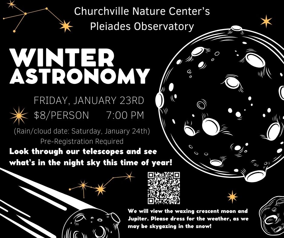 Come to our Pleiades Observatory at the Churchville Nature Center and learn about what’s in the night sky this time of year! On Friday, January 23rd at 7:00 pm, learn about the moon and planets, then get the chance to look at them through our telescopes. Highlights of the evening can include the waxing crescent moon and the Planet Jupiter. Admission is $8/person. Registration is required. Register here: https://app.dvforms.net/api/dv/y30qj7 This program is for adults and children ages 12+. We will begin promptly at 7 pm with a brief walk to the observatory. Expected duration of the program is 2 hours. If you have ADA accessibility requirements, please contact our Public Events Coordinator, Megan (v-mbkeller@buckscounty.org). **In the event of inclement weather, the rain date will be Saturday, January 24th** A note about the weather: It will be cold! This program is entirely outdoors. The observatory is not heated. Please dress warm and expect to walk in the snow. Bringing handwarmers and warm beverages are encouraged!