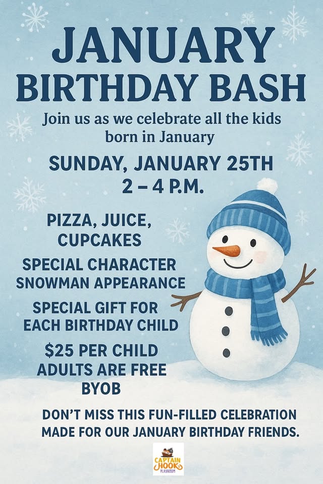 Calling all kids born in January! Join us for a special January Birthday Bash as we celebrate our winter birthday friends in style. Enjoy pizza, juice, cupcakes, and lots of fun with friends—plus a special guest appearance by Olaf to make the day extra magical! Each birthday child will receive a special gift, and there will be plenty of photo opportunities, playtime, and winter-themed fun. All are welcome to come celebrate.