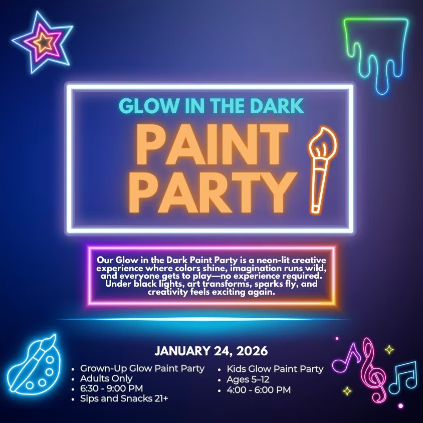 Ages 5-12Turn down the lights and let kids’ creativity shine! Neon paints, black lights, music, and glowing masterpieces—no experience needed.